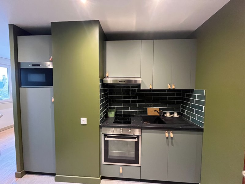 Ce studio entièrement rénové vous offre, un espace cuisine aménagée et équipée séparé, un espace lingerie avec lave linge séchant et lave vaisselle.