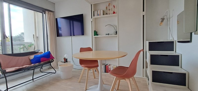 Ce studio se compose d'une belle pièce de vie avec cuisine donnant sur un agréable balcon, entrée avec placard, salle d'eau avec WC et branchement machine à laver.