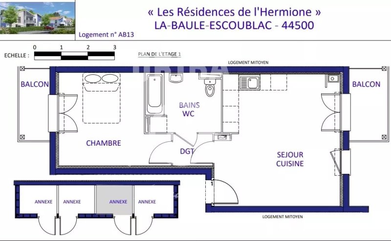 NEUF VEFA- Le clos de l'Hermione. Emplacement idéal à 700 m de la Gare SNCF et des Commerces de PORNICHET, APPARTEMENT de 42.92 M² Hab. Entrée, cuisine ouverte sur le séjour, balcons, salle d'eau et wc, une chambre et un parking. Exposition sud. Frais de notaires réduits.