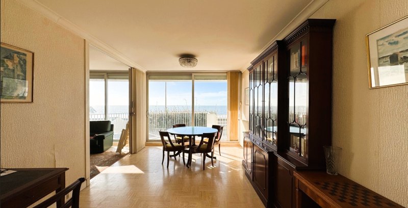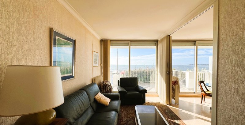 Appartement traversant en RDC surélevé, composé d'une entrée avec placards, une cuisine indépendante, un salon et un séjour exposé sud donnant sur une terrasse et face mer avec accès privatif sur la terrasse de 16m2. Deux chambres, une salle de bains, un WC.