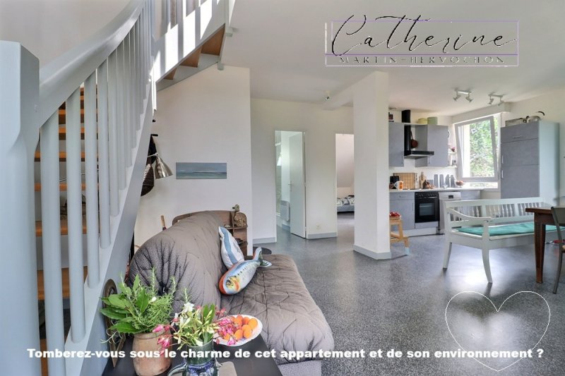 Loire-Atlantique, La Baule (44500), Dans une petite copropriété de 6 appartements édifiée dans un écrin de verdure, Appartement en duplex occupant le 2ème et dernier étage comprenant sur le 1er niveau : Entrée dans le séjour/salon de 35.m² avec cuisine ouverte aménagée et équipée (lave-vaisselle, plaque électrique, hotte, four, réfrigérateur/congélateur, micro-ondes), chambre, salle d'eau avec WC et espace buanderie ; Sur le 2ème niveau, en duplex : palier avec rangements sous les rampants et dégagement faisant office de chambre.
