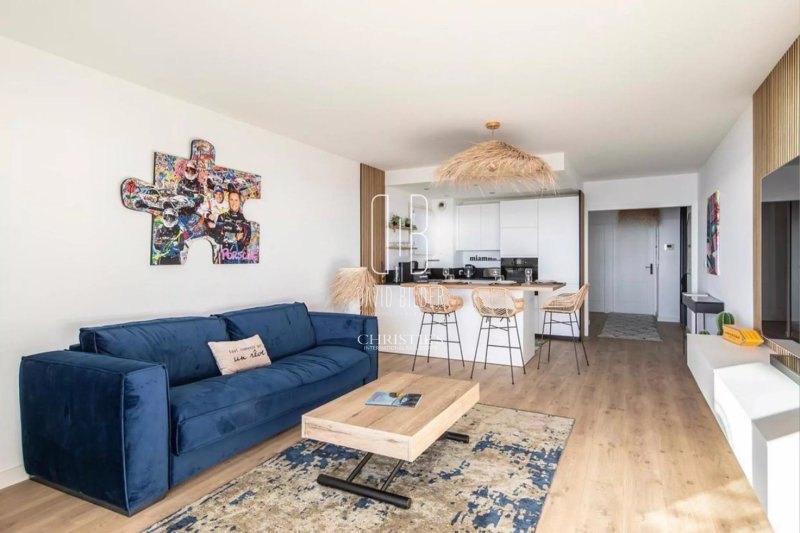 62m2 de vie, un salon face mer, beau balcon exposé Sud, une cuisine équipée, une salle d'eau moderne, 2 chambres sur l'arrière avec accès à un patio verdoyant au calme.