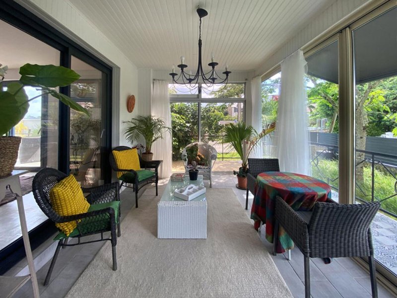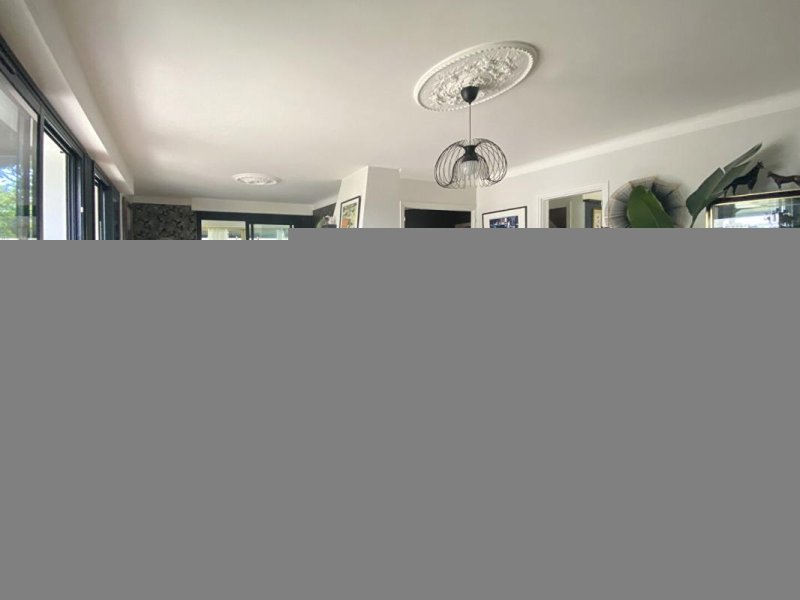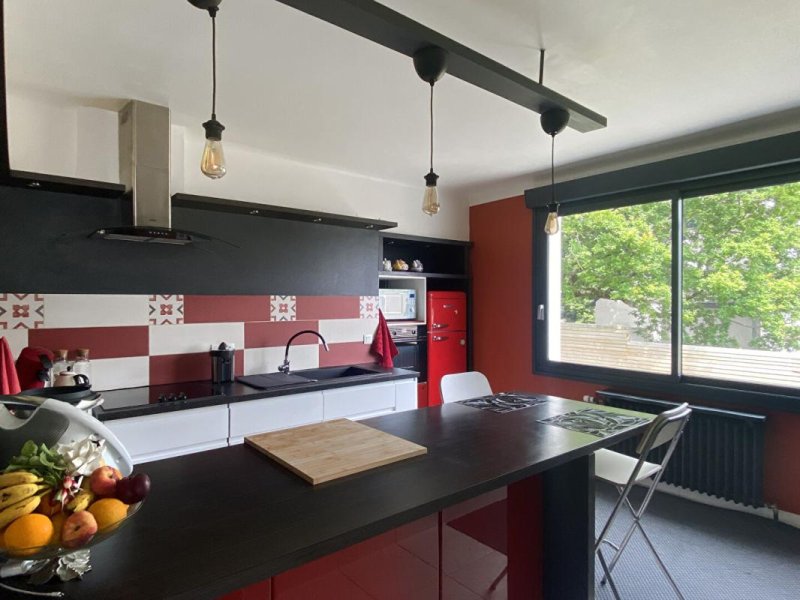 56400. Auray. En exclusivité, grand appartement T4, 133m2 hab entièrement rénové, 3 chambres, situé en rdc d'une belle maison d'Architecte avec jardin dans un quartier résidentiel calme et recherché proche Gare TGV, écoles et commerces. Il offre une entrée via une lumineuse véranda orientée Sud Ouest, 3 belles chambres, vaste salon salle à manger lumineux avec cheminée ouvrant sur une grande terrasse bois de 32m2 orientée Sud, balcon coursive avec 2 stores bannes électriques Sud et Ouest, cuisine contemporaine aménagée et équipée, sdb, wc, buanderie et cave de 18m2 en sous-sol, 2 places de parking. Jardin arboré de 142m2. Chaudière pompe à chaleur, appartement relié à la fibre.