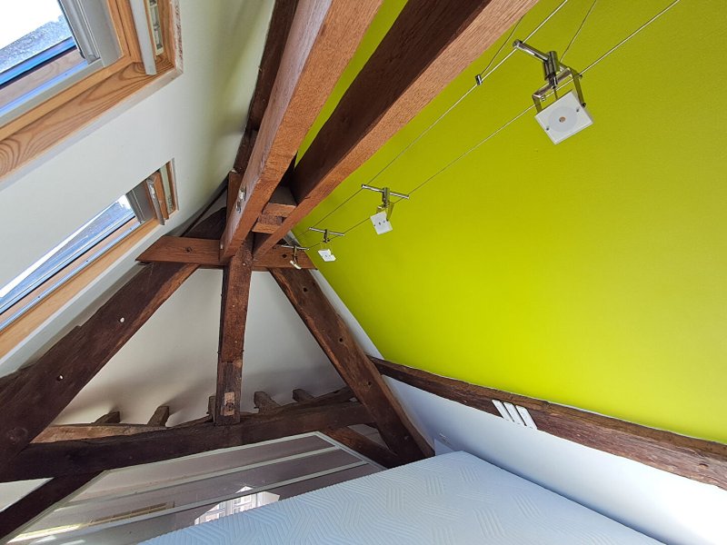 À l'étage, découvrez une mezzanine sous les combles qui comprend un coin nuit douillet ainsi qu'une baignoire, parfaite pour se détendre après une journée au bord de la mer.