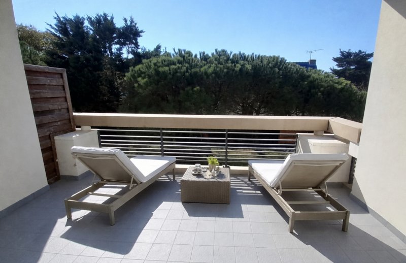 Au sein d'un ensemble résidentiel composé de petits collectifs de deux étages et de maisons individuelles, en bordure immédiate de la Côte Sauvage, cet appartement bénéficie d'un environnement paysager privilégié, alliant calme absolu et accès direct à la plage.