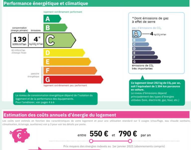 Montant estimé des dépenses annuelles d'énergie pour un usage standard entre 550 euros et 790 euros. Prix moyens des énergies indexés au 1er janvier 2021 (abonnements compris), si logement F ou G 'Logement à consommation énergétique excessive : classe F ou G')