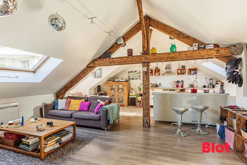 Avec ses 37 m² loi Carrez et plus de 53 m² au sol, il offre de beaux volumes et un espace optimisé sous les combles, sublimé par de magnifiques poutres apparentes qui lui confèrent un cachet unique. La pièce de vie, particulièrement lumineuse, constitue un véritable espace de convivialité.
