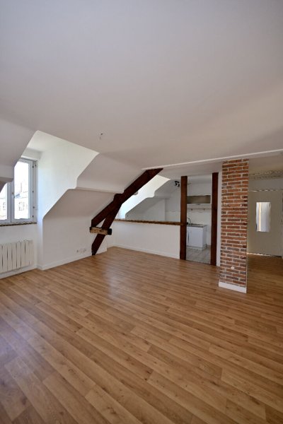 L'appartement se compose d'une vaste pièce de vie lumineuse avec cuisine américaine, de deux chambres confortables, ainsi qu'une salle de bain. Les poutres et briques apparentes apportent un caractère unique et chaleureux à ce bien rare sur le secteur.