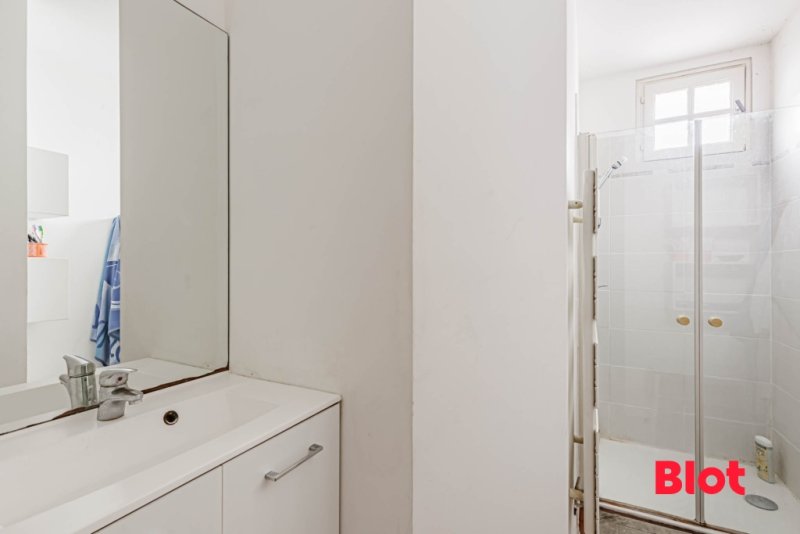 L'entrée semi-ouverte sur la cuisine dessert la salle d'eau et les WC séparés, puis mène à un bel espace de vie de plus de 27 m².