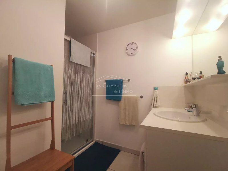 Entrée avec placard ouverte sur un salon/séjour lumineux exposé ouest et une cuisine équipée (gazinière, hotte, lave-vaisselle) avec accès sur une terrasse d'environ 17m², un couloir desservant deux chambres avec chacune un placard, salle d'eau, WC, buanderie.
