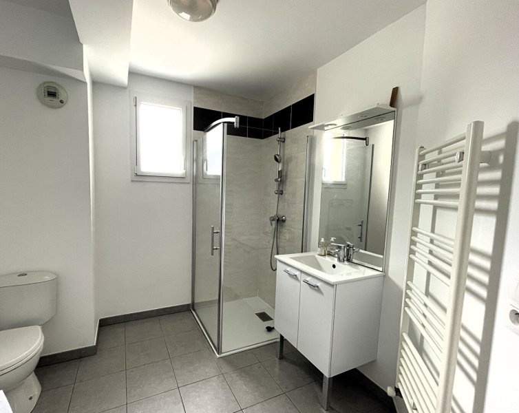 Rez-de-chaussée : entrée, salon-séjour avec balcon exposé sud, cuisine aménagée équipée ouverte, deux chambres dont une avec placard, salle d'eau avec WC.