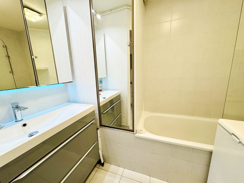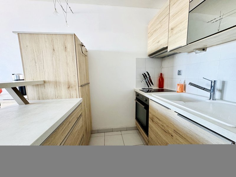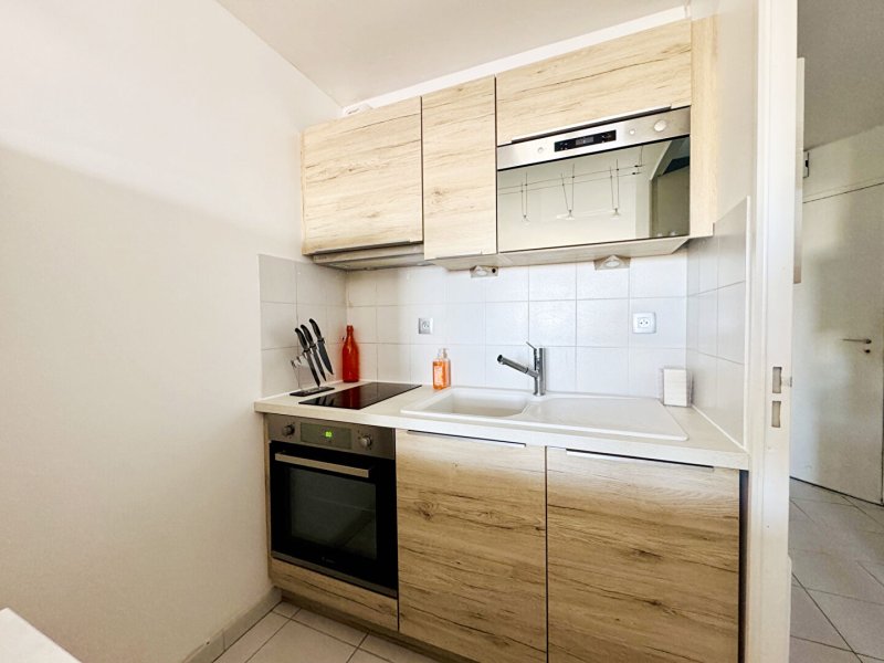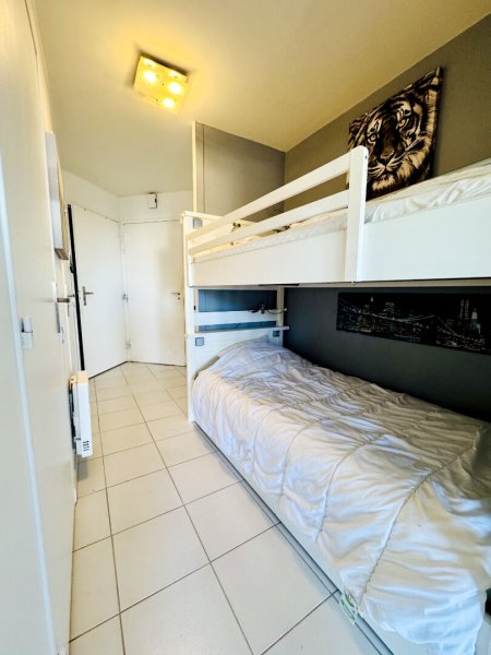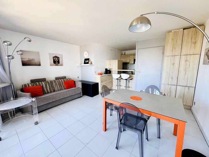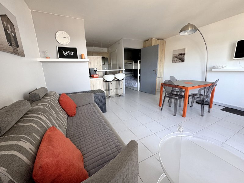 Dès l'entrée, un coin nuit astucieusement aménagé offre un espace de couchage distinct et optimisé. La cuisine, aménagée et entièrement équipée, s'ouvre sur une pièce de vie lumineuse exposée Ouest, baignée de lumière naturelle.