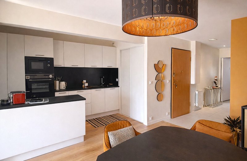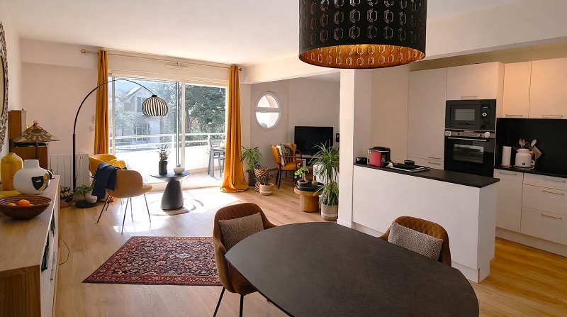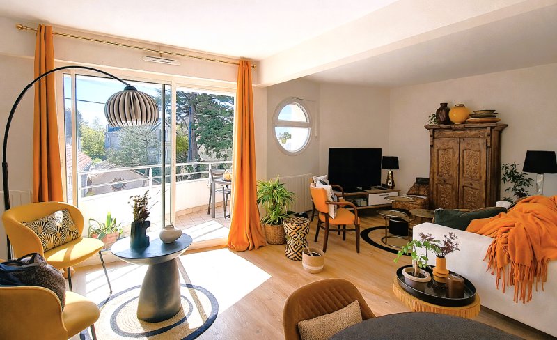 Idéalement situé en plein coeur de Pornichet, dans le quartier de la gare, permettant de tout rejoindre à pied (commerces, marché, plage), petite copropriété récente de 10 lots d'habitation. L'appartement se situe au 2ème étage, a bénéficié d'une rénovation complète en 2022, offrant des prestations de qualité et élégantes. L'entrée dessert une très belle pièce à vivre avec cuisine aménagée et équipée se prolongeant sur la terrasse exposée S/O avec vue dégagée. 2 chambres, une salle d'eau et WC indépendants. Nombreux placards. En annexe, un parking en sous-sol et une cave.