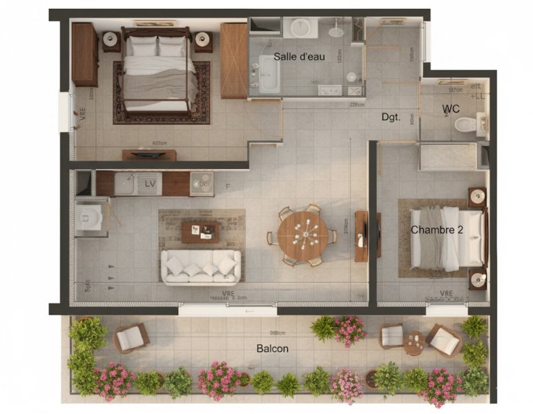 Situé au deuxième étage d'une résidence récente et sécurisée, cet appartement T3 de 59,60 m² offre un agencement fonctionnel et une luminosité naturelle appréciable. Il propose une pièce de vie avec cuisine ouverte, donnant accès à un balcon exposé Sud de près de 20 m², apportant un extérieur agréable et un bon ensoleillement.
