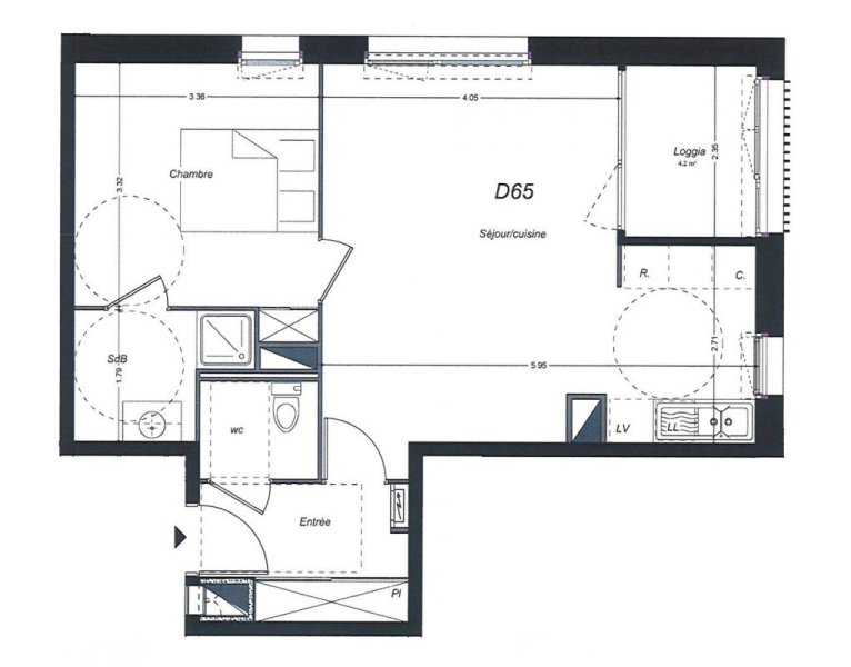 Il se compose d'une entrée avec placards, une pièce principale à la double exposition avec cuisine ouverte aménagée l'ensemble donnant sur une loggia chauffée, une chambre, une salle d'eau, toilettes séparés.