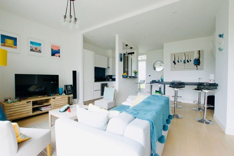 Appartement comprenant : une entrée avec placard, un WC, une cuisine aménagée et équipée faite sur mesure par un menuisier local, une pièce de vie VUE MER donnant sur un jardin privatif de 50m²,