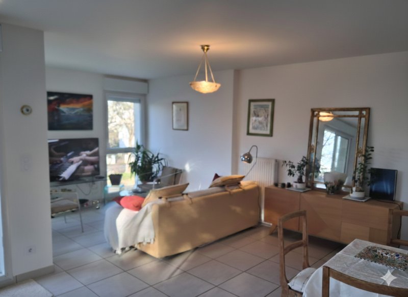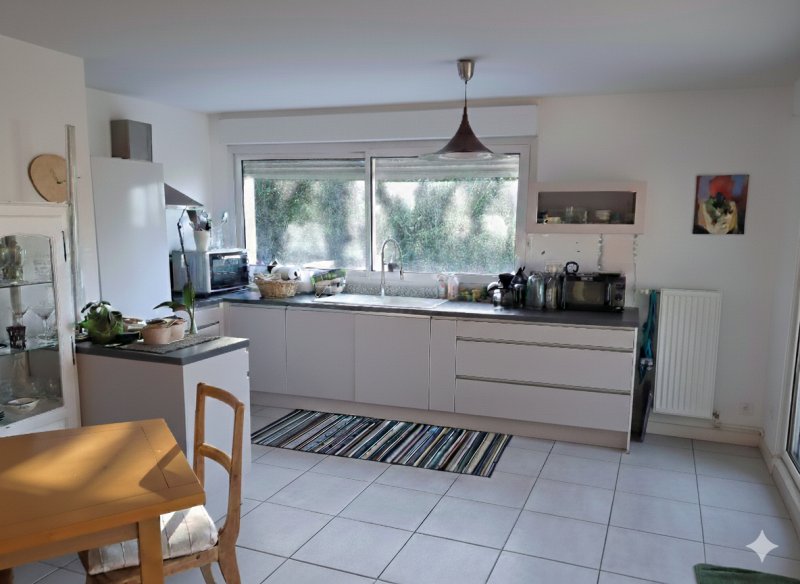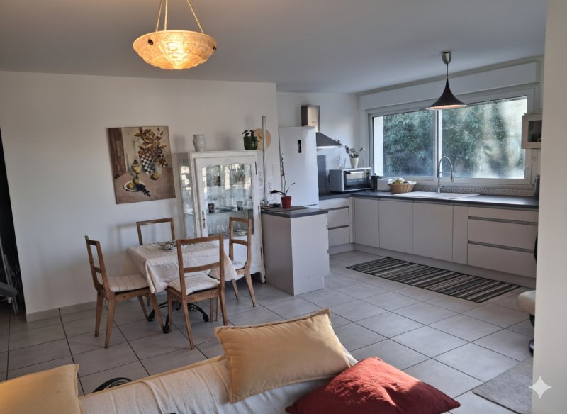 Le séjour lumineux, exposé sud-ouest, bénéficie d'un excellent ensoleillement tout au long de la journée et s'ouvre sur une cuisine haut de gamme, équipée et aménagée.