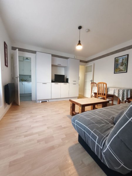 Le séjour d'environ 15 m² bénéficie d'une belle luminosité, tandis que la chambre de 11 m² propose un espace calme et agréable. Vous trouverez également une cuisine, une salle d'eau avec WC, une cave isolée, ainsi qu'un jardin et un parking communs.