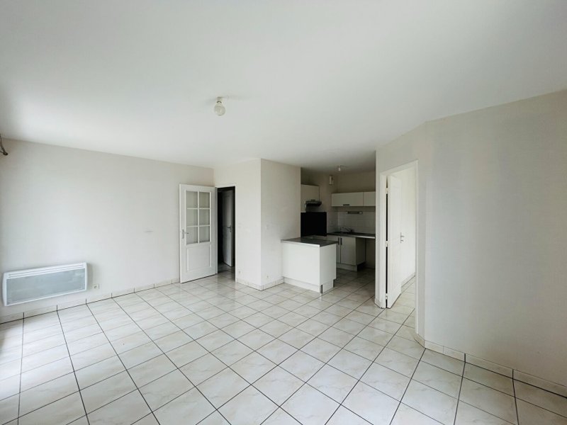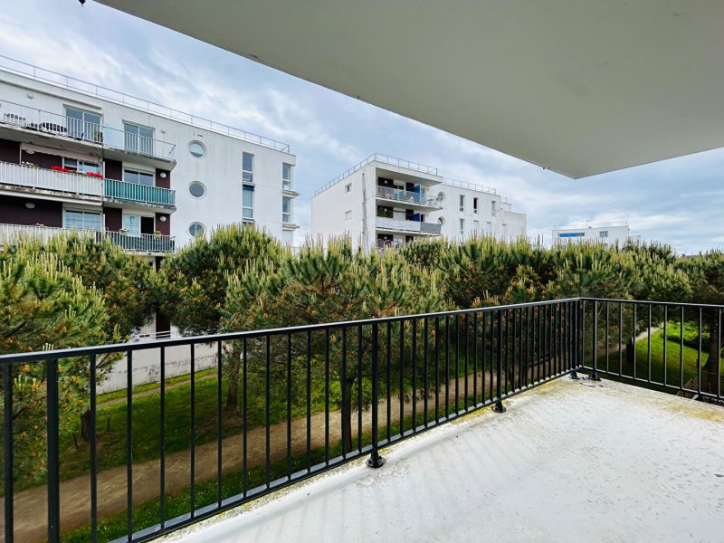 Entrée avec placard, deux chambres, salle de bains et pièce de vie lumineuse ouvrant sur un balcon de 8M².