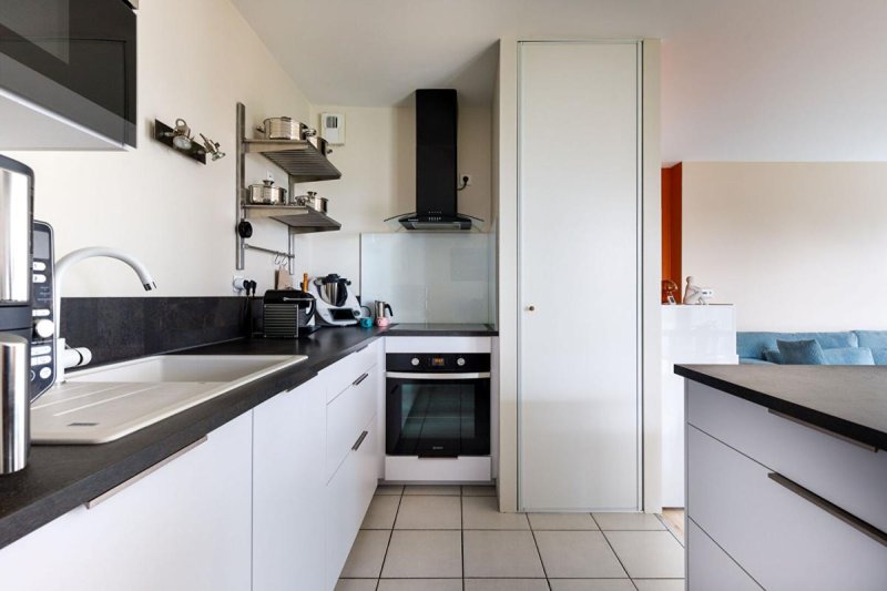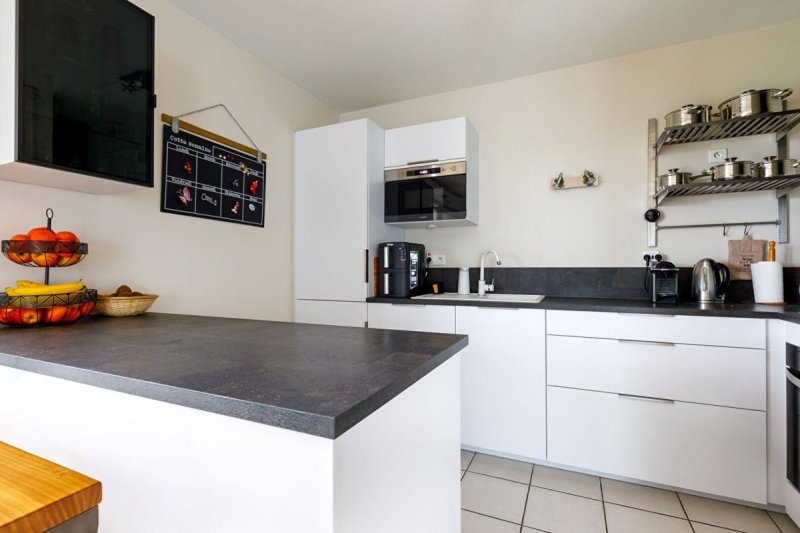 L'entrée avec placard dessert une pièce de vie spacieuse et lumineuse avec cuisine aménagée et équipée ouverte donnant sur un agréable balcon.