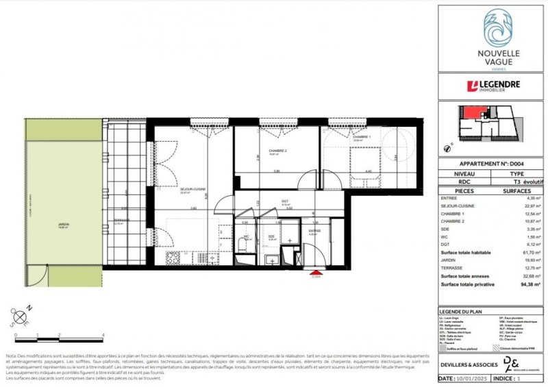 NOUVELLE VAGUE, la promesse d'une nouvelle vie accessible à tous. Découvrez au coeur du quartier du Bondon à Vannes, Nouvelle Vague ! Situé sur le boulevard du Général Monsabert, le projet bénéficie d'une situation privilégiée permettant de rejoindre facilement la rocade, ainsi que la Gare de Vannes. Le centre-ville peut être rejoint par le biais de plusieurs lignes de bus, tout comme les deux zones commerciales situées à quelques minutes seulement du projet. Nouvelle Vague regroupe 3 résidences à taille humaine et proposera 66 appartements du studio au 5 pièces. Tous les logements seront prolongés par des espaces extérieurs : balcons, terrasses ou jardins privatifs pour vous offrir une véritable pièce de vie supplémentaire. Nouvelle Vague disposera également de locaux à vélos et de places de stationnement en sous-sol. L'atout majeur de Nouvelle Vague réside en son coeur d'îlot : une micro-forêt urbaine de 3 hectares, et son aire de jeux pour enfants. Ce lieu de vie réjouira petits et grands. Balades, jogging, etc. Démarrage des travaux : T3 2025 Livraison prévisionnelle : T3 2027. Une résidence accessible à tous ! Éligible dispositif PTZ et LMNP (nombreuses écoles supérieures) Les informations sur les risques auxquels ce bien est exposé sont disponibles sur le site Géorisques : www.georisques.gouv.fr Copropriété de 66 lots - dont 66 lots habitation. (Pas de procédure en cours). Charges annuelles : 992 euros.