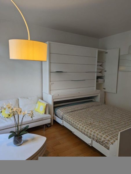 un séjour lumineux avec deux grandes fenêtres et petits balconnets, un lit escamotable télécommandé haut de gamme, du mobilier Cinna et Bo Concept, une cuisine intégrée entièrement équipée, et une belle salle de bain avec WC.