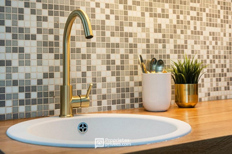 La cuisine, aménagée et équipée (plaques à induction, micro-ondes, réfrigérateur/congélateur et lave-linge), s'intègre harmonieusement à l'espace : fonctionnelle et esthétique.