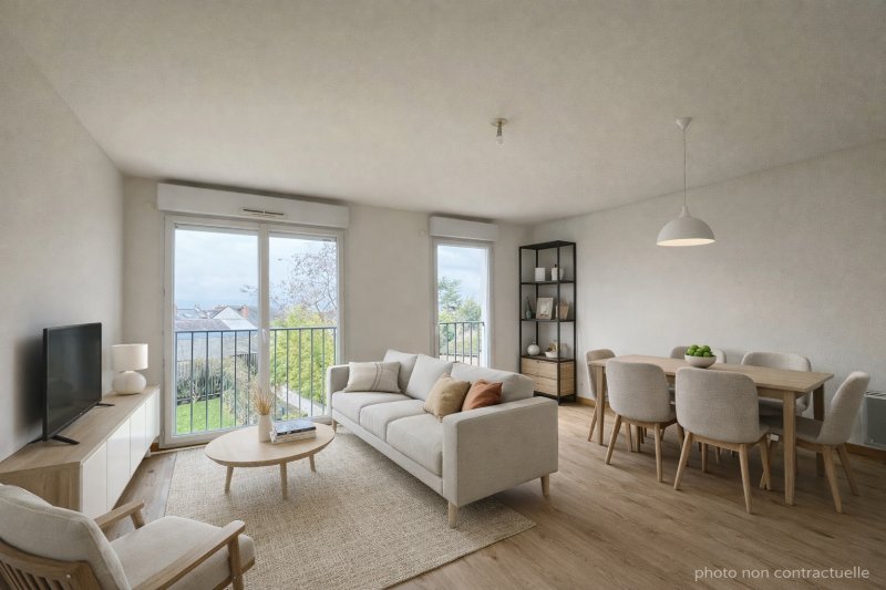 Entrée avec placard, salon/salle à manger lumineux donnant sur l'arrière de la copropriété, deux chambres avec rangements, une salle de bains et WC.