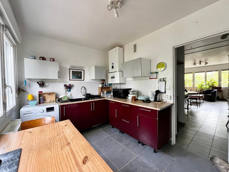 Au premier étage, appartement T3 comprenant une entrée avec placards, un séjour double offrant la possibilité de créer une troisième chambre et une cuisine aménagée et équipée avec une arrière-cuisine.