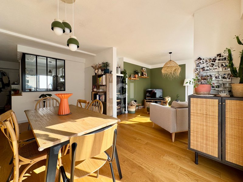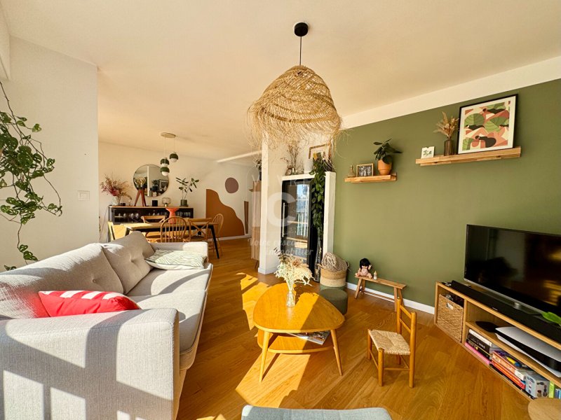 Le salon-séjour lumineux offre un bel espace de vie, idéal pour se retrouver en famille ou entre amis, avec une cuisine semi-ouverte, aménagée et équipée, parfaite pour partager des instants conviviaux.