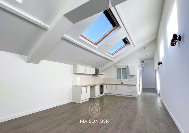 Grande pièce de vie lumineuse avec cuisine équipée, ouvrant sur une terrasse orientée ouest à la vue dégagée.