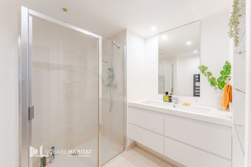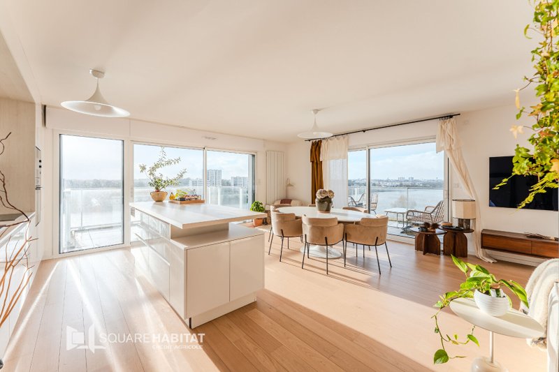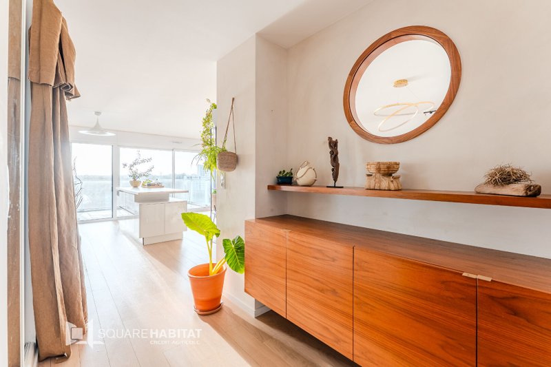 Ce bien de 88m² se compose d'une belle entrée avec meuble sur-mesure, d'une pièce à vivre avec cuisine ouverte aménagée et équipée d'éléments haut de gamme, baignée de lumière naturelle grâce à ses grandes ouvertures donnant sur deux terrasses exposées Sud.
