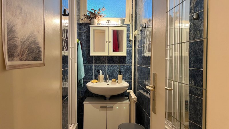 Vous y découvrirez une entrée avec placard, un salon-séjour lumineux de 27m² exposé sud-ouest, ainsi qu'une cuisine fermée.