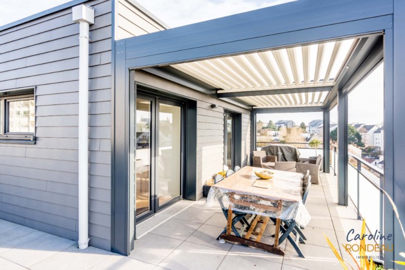 Caroline Rondeau Immobilier vous propose : A vendre Nantes Tortière proche Erdre, ce bel appartement T4 en roof top, dernier étage, ascenseur, 3 chambres, Double garage. Un confort absolu : Il offre tout d'abord une grande terrasse ensoleillée sud-Ouest. Seul a son étage, comme "une maison sur le toit". Il s'inscrit sur une petite copropriété de 2019. Les aménagements y sont soignés et séduiront les plus exigeants. Une grande pièce de vie sur parquet sur près de 60 m² donnant sur la terrasse de 55 m² . Une pergola bioclimatique y a été installé et protège aussi bien du soleil que de la pluie en terrasse...L'espace séjour est semi ouvert sur une cuisine contemporaine sur mesure et avec sa verrière, un coin bureau s'est installé en retrait du séjour. L'espace nuit est séparé et composé de 3 chambres, dont une suite parentale avec balcon dressing et salle d'eau. Les 2 autres chambres sont aménagés de placards, Une 2ème salle d'eau, wc séparés avec lave-mains. Les annexes complètent ce bien rare, avec un double garage (une prise pour voiture électrique y a été installé). Local vélos sur la copropriété. Résidence de 24 lots. Chauffage individuel gaz. Appartement économe en énergie. Les acquéreurs pourront bénéficier d'une garantie décennale qui se poursuit encore 4 ans... Unique et situé aux pieds de toutes les commodités et de l'Erdre cet appartement vous permettra un confort absolue au coeur d'un quartier prisé de Nantes. Pour plus de renseignement ou le visiter me contacter Caroline Rondeau 06 84 07 52 63.