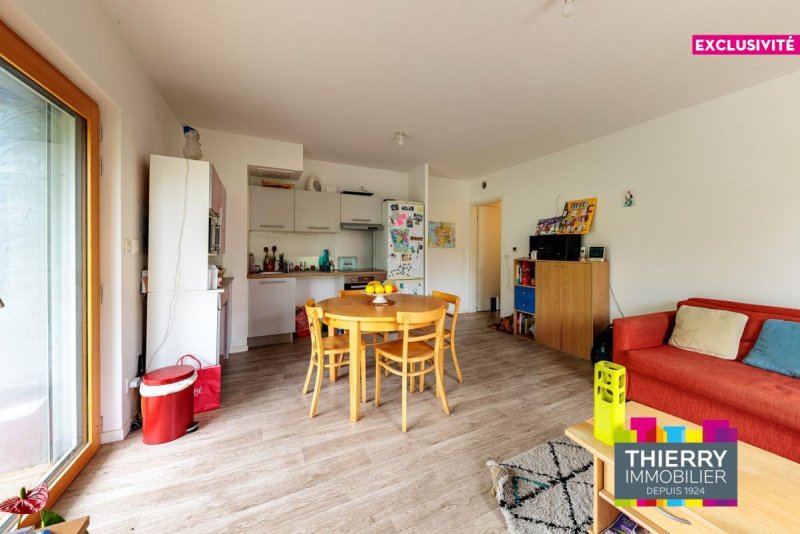 L'entrée dessert deux chambres, une salle de bains et des toilettes séparées. La pièce de vie lumineuse, avec cuisine ouverte, s'ouvre sur un balcon de plus de 7m².