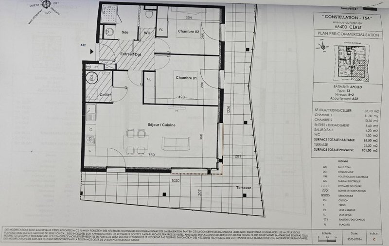 A Céret, situé sur la friche de l'ancienne gare dans une résidence de standing, venez découvrir ce bel appartement T3 (RE 2020 ) situé au 2nd étage de la résidence CONSTELLATION 154, d'une superficie habitable de 65 m2 bénéficiant d'une belle terrasse de 35m2 orientée Sud-est. Un salon-cuisine ouverte de 33 m2 , une chambre de plus de 11m², une seconde chambre de plus de 10 m², une salle d'eau et un wc indépendant. Le bien est vendu avec une place parking, un garage double et une cave. Belles prestations pour votre futur appartement. Idéal résidence principale, secondaire ou investissement. Pour plus d'information contactez-moi, produit rare. Bien en copropriété composée de 26 appartements répartis sur 2 bâtiments de 3 étages avec ascenseur. Prix: 257 000 euros frais d'agence inclus, charges vendeur. Bien non soumis au DPE, pas de procédure en cours. Pour visiter et vous accompagner dans votre projet, contactez Franck LEFEBVRE, au 0673738285 ou par courriel à f.lefebvre@proprietes-privees.com Cette présente annonce a été rédigée sous la responsabilité éditoriale de Franck LEFEBVRE agissant sous le statut d'agent commercial immatriculé au RSAC PERPIGNAN 478849896 auprès de la SAS PROPRIETES PRIVEES, Réseau national immobilier, au capital de 40000 euros, 44 ALLÉE DES CINQ CONTINENTS - ZAC LE CHÊNE FERRÉ, 44120 VERTOU, RCS Nantes n° 487 624 777 00040, Carte professionnelle T et G n° CPI 4401 2016 000 010 388 CCI Nantes-Saint Nazaire. Garantie GALIAN - 89 rue de la Boétie, 75008 Paris Mandat réf : 428 135-Le professionnel sécurise et garantit votre projet immobilier- Selon l'article L.561.5 du Code Monétaire et Financier, pour l'organisation de la visite, la présentation d'une pièce d'identité vous sera demandée. Cette présente annonce a été rédigée sous la responsabilité éditoriale de Franck LEFEBVRE agissant sous le statut d'agent commercial immatriculé au RSAC PERPIGNAN 478849896 auprès de SAS PROPRIETES PRIVEES, au capital de 44 920 euros, ZAC LE CHÊNE FERRÉ - 44 ALLÉE DES CINQ CONTINENTS 44120 VERTOU; SIRET 487 624 777 00040, RCS Nantes. Carte Professionnelle Transactions sur immeubles et fonds de commerce (T) et Gestion immobilière (G) n°CPI 4401 2016 000 010 388 délivrée par la CCI Nantes - Saint Nazaire. Compte séquestre n°30932508467 BPA SAINT-SEBASTIEN-SUR-LOIRE (44230). Garantie GALIAN-SMABTP - 89 rue de la Boétie, 75008 Paris - n°28137 J pour 2 000 000 euros pour T et 120 000 euros pour G. Assurance responsabilité civile professionnelle par GALIAN-SMABTP n° de police 28137.J Les informations sur les risques auxquels ce bien est exposé sont disponibles sur le site Géorisques "www.georisques.gouv.fr" - Copropriété de 52 lots - dont 26 lots habitation. (). Charges annuelles : 1200 euros. Franck LEFEBVRE (EI) Agent Commercial - Numéro RSAC : PERPIGNAN 478849896 - .