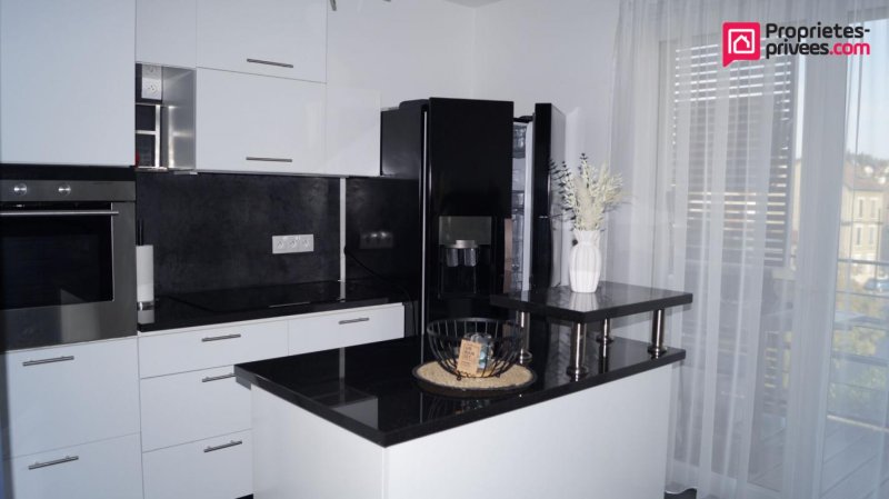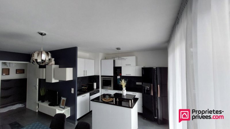 Dans le prolongement, on y découvre une cuisine meublée, équipée et aménagée avec plusieurs rangements, de couleur moderne et chic.
