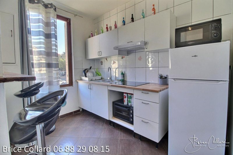 Situé au premier étage d'un immeuble de 6 appartements, entrée sur séjour, cuisine ouverte (aménagée et équipée), dégagement, chambre, débarras, salle de douche avec wc.