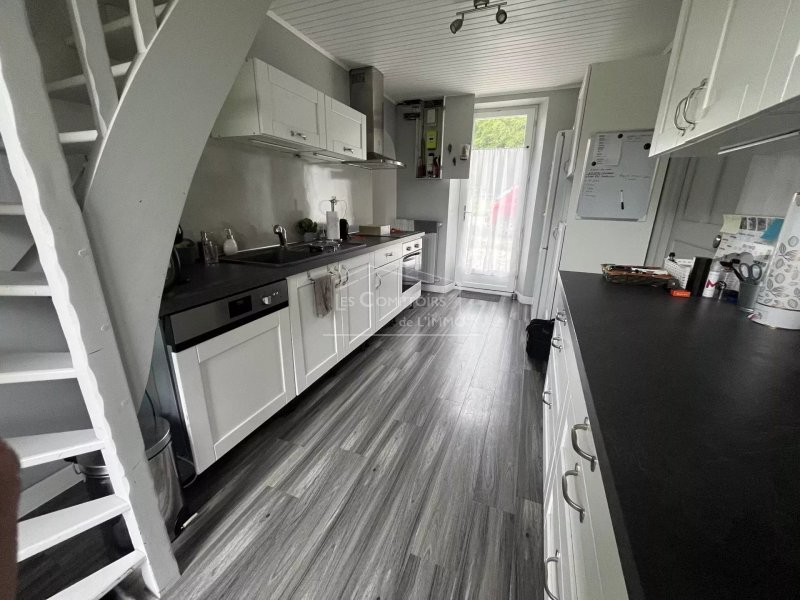 Cuisine aménagée et équipée (plaque, hotte, four, lave-vaisselle), dégagement, chambre, séjour, WC, salle de bains.