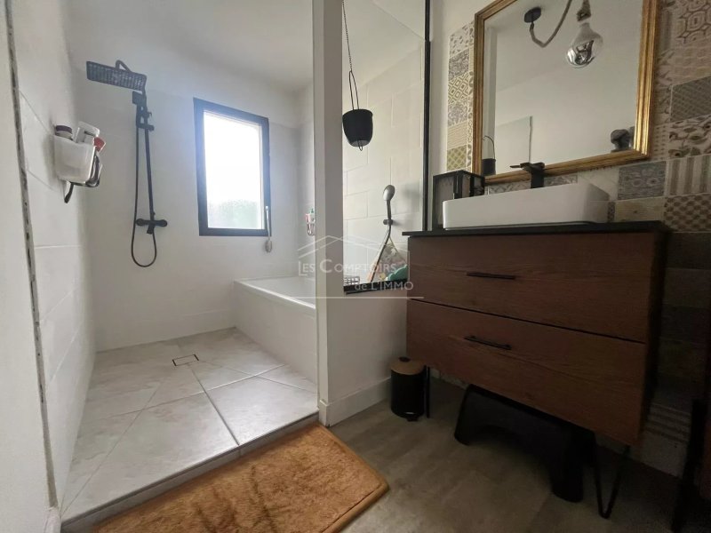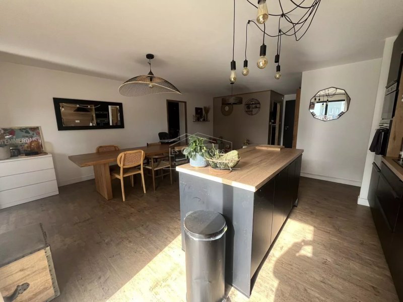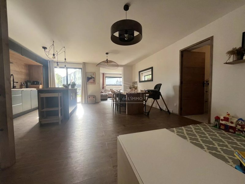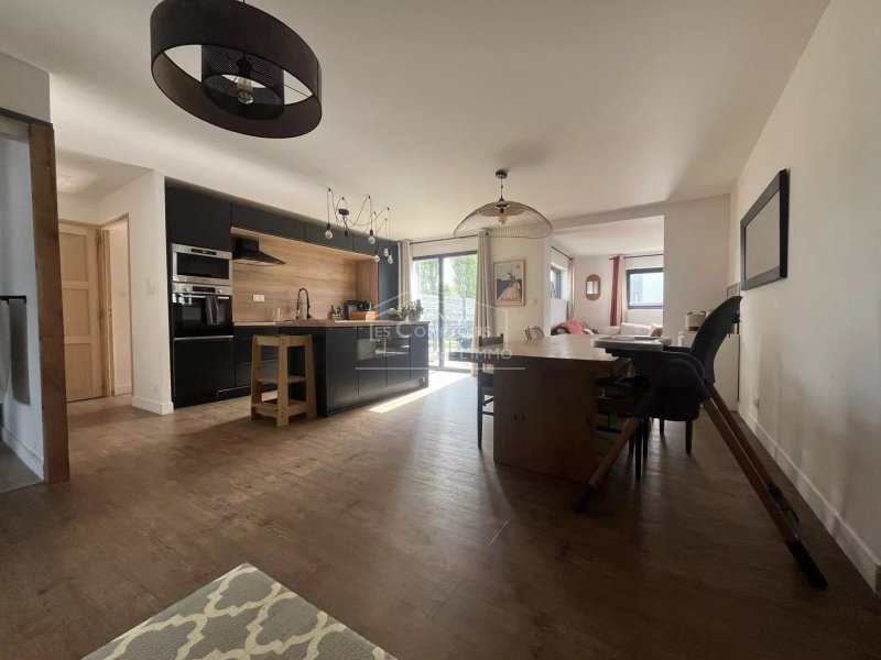 Séjour/cuisine aménagée et équipée (plaque, hotte, four, lave-vaisselle, réfrigérateur), arrière-cuisine (buanderie), salle de bains + douche, WC, 3 chambres dont 1 avec dressing, salon.