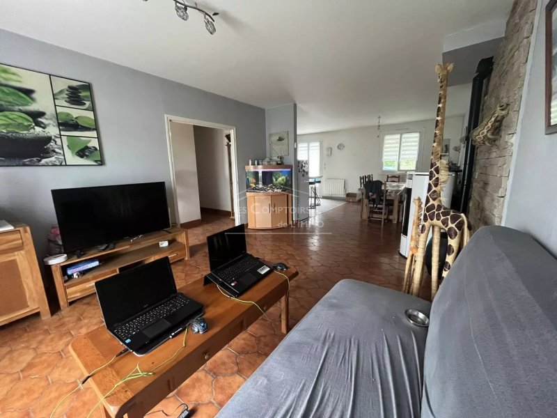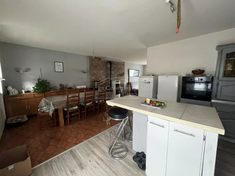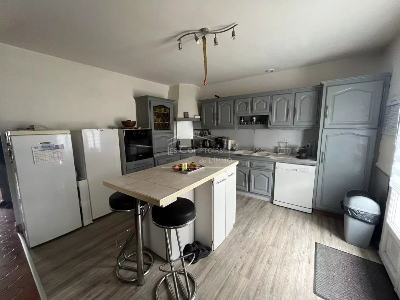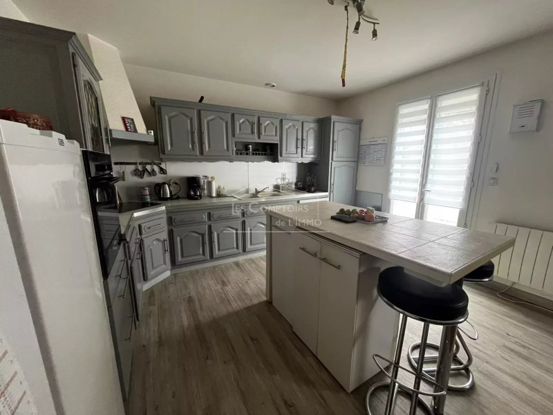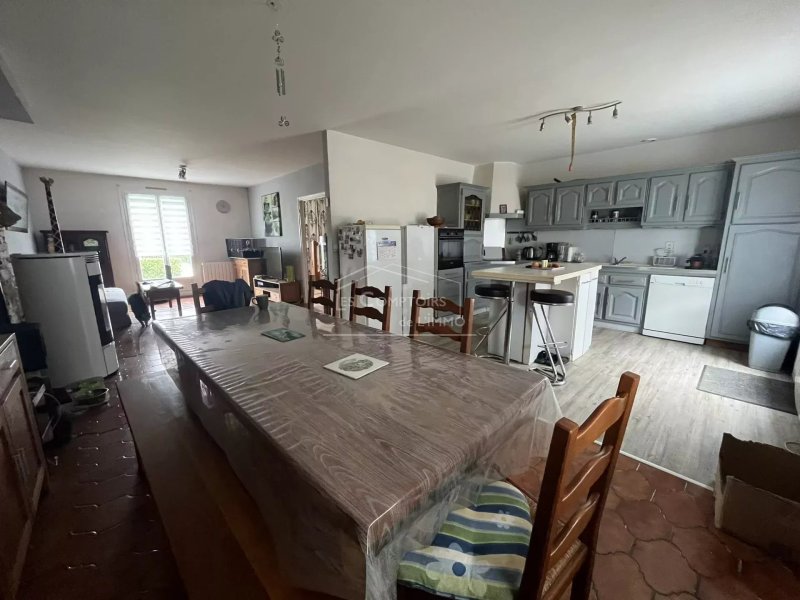 Donges centre, maison à usage d'habitation comprenant au RDC : entrée, séjour avec poêle à pellet, cuisine aménagée et équipée (plaque, hotte, four), dégagement, salle de bains, WC, trois chambres.