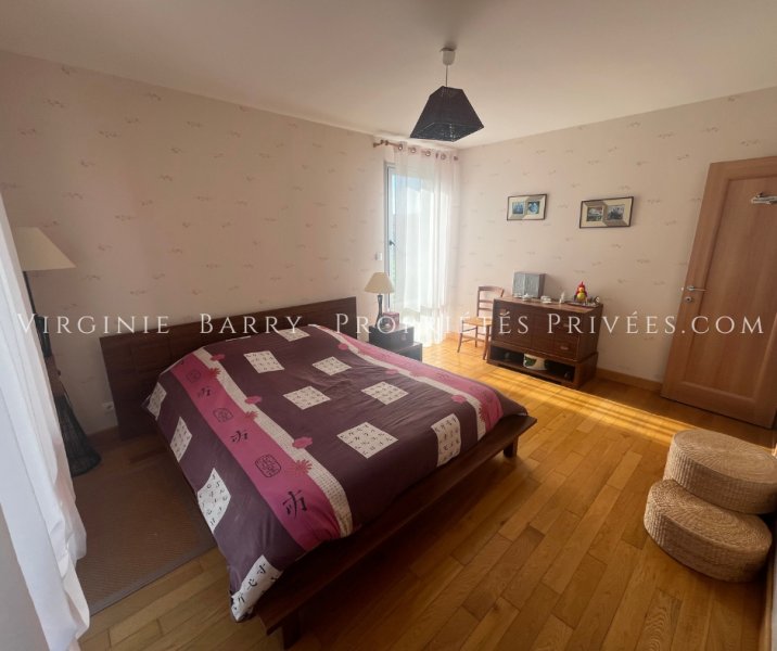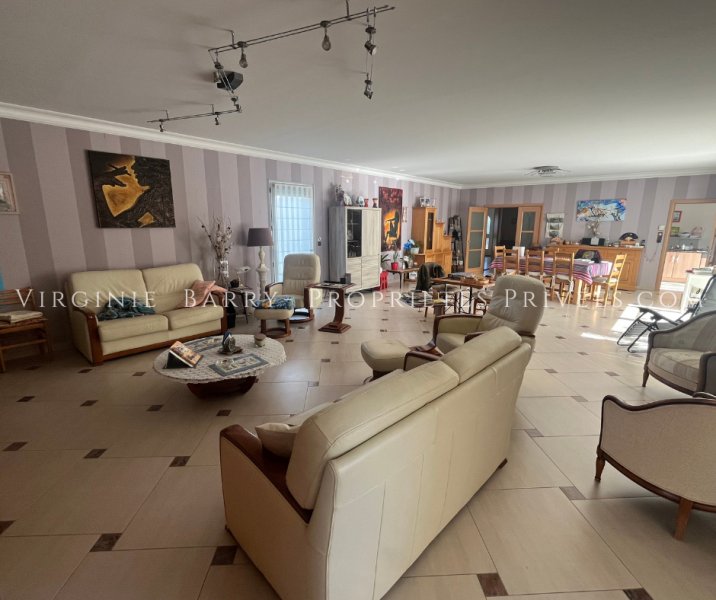 Edifiée en 2005 sur un vaste terrain constructible de 2236 m², elle se compose d'un hall d'entrée, d'une cuisine indépendante entièrement aménagée et équipée donnant sur une spacieuse salle à manger et sur un salon lumineux avec accès direct à la terrasse. Vous y trouverez également un bureau, 4 chambres confortables dont une suite parentale, une salle de bains, ainsi qu'un cellier et une lingerie.