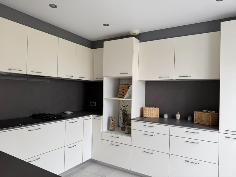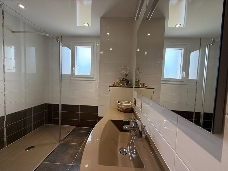 Elle se compose d'une entrée avec placard, desservant une salle à manger lumineuse avec poêle à bois, ouverte sur une cuisine récente aménagée et équipée. Dans la continuité, une belle pièce de vie avec une grande hauteur sous plafond.