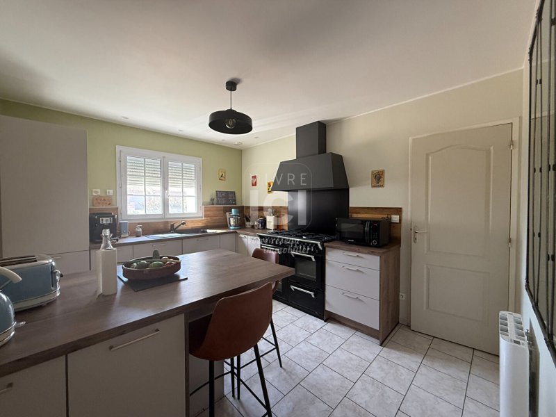 La maison principale, de plain-pied, offre une belle pièce de vie lumineuse avec cheminée insert, une cuisine récente aménagée et équipée, un cellier , 4 chambres, un grand bureau pouvant convenir à une activité professionnelle ou à une salle de jeux, une salle de bains, un WC indépendant et un garage.