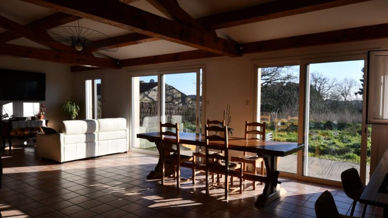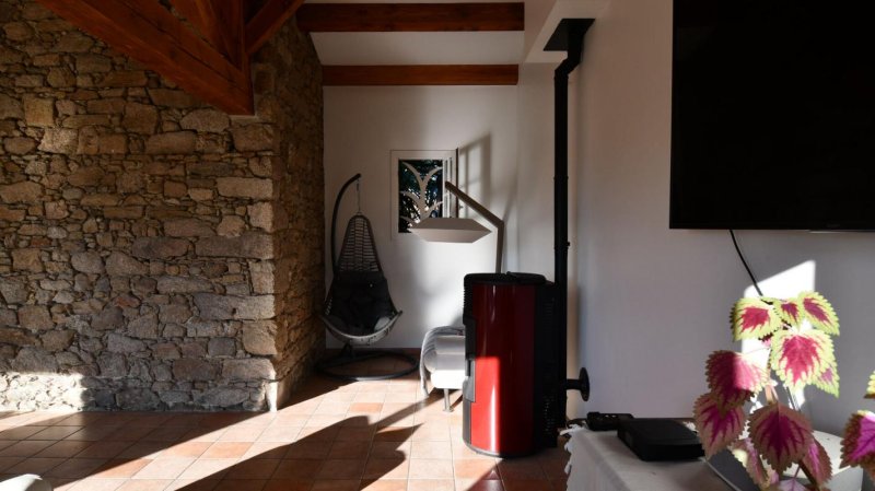 A l'intérieur, un hall d'accueil s'ouvre sur une pièce de vie lumineuse fraichement repeinte, chaleureusement habillée de pierre et de bois, équipée d'un poêle à granulés récent (2019). La cuisine aménagée et équipée (2022) séduit par sa modernité et sa fonctionnalité.