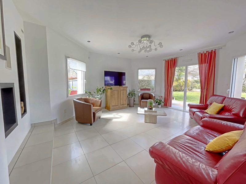 Le hall d'entrée s'ouvre sur un espace de vie de 74 m² réparti de la façon suivante : une salle à manger conviviale, un salon chaleureux et une cuisine ultra équipée disposant d'une baie à galandage donnant directement sur le jardin. Cet ensemble forme un lieu de vie à la fois confortable, lumineux et ouvert sur l'extérieur.
