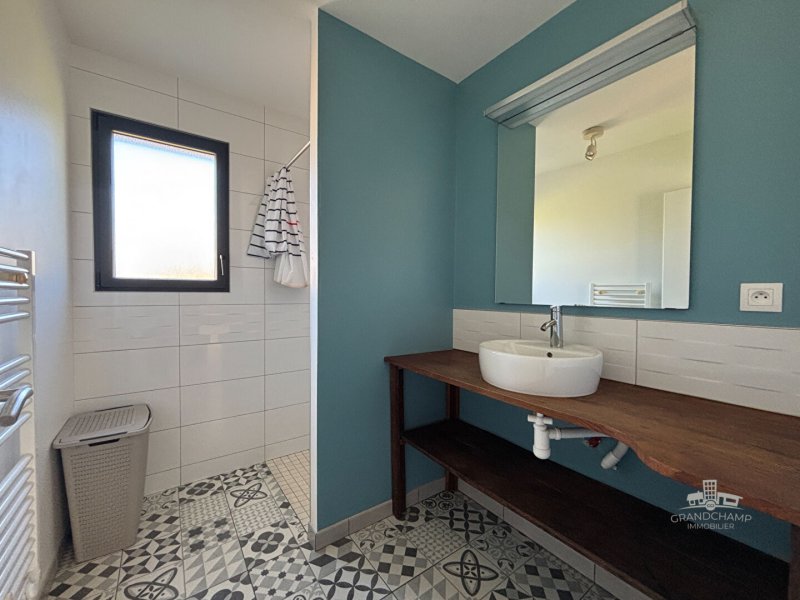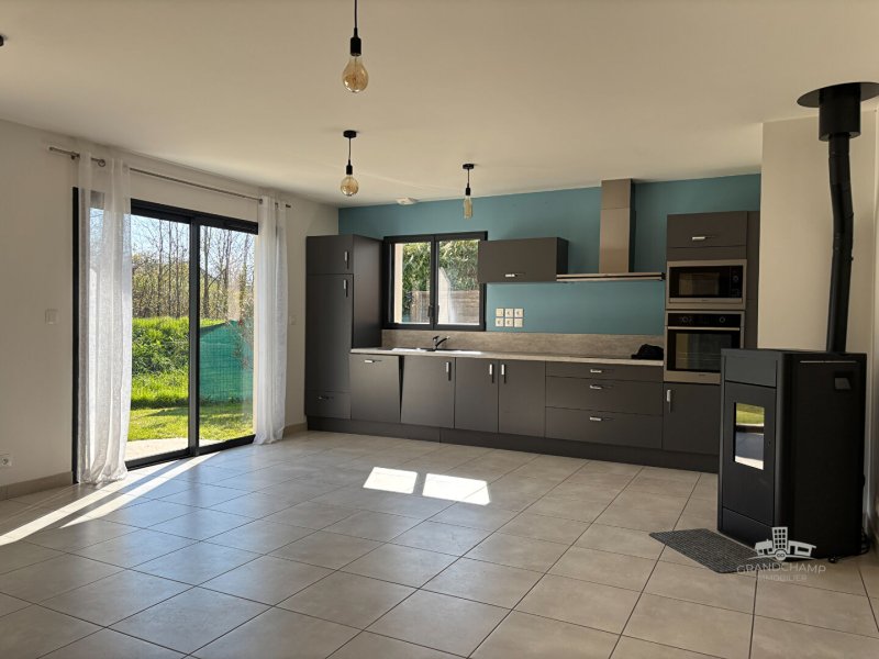 Vous entrez dans un hall avec placards qui vous mène dans une spacieuse pièce de vie comprenant cuisine aménagée - équipée, salon - séjour avec poêle à pellet, l'ensemble donnant sur la terrasse vous permet de profiter de la nature à l'abri de tout regards.