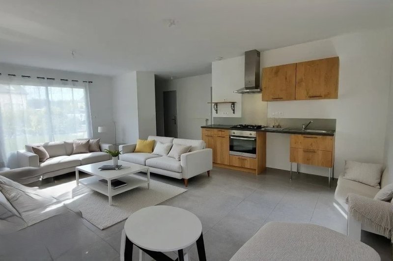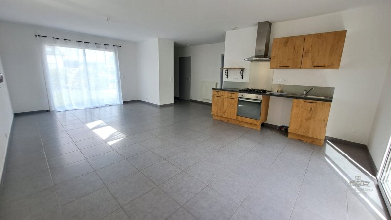 Spacieuse pièce de vie baignée de lumière naturelle, avec cuisine ouverte aménagée
