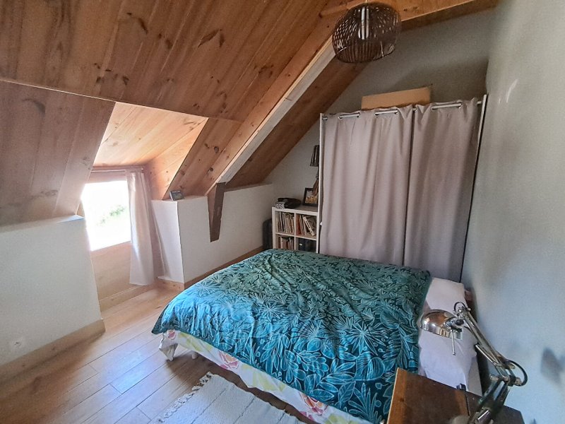 Au rez-de-chaussée, vous retrouverez une pièce de vie lumineuse avec un poêle à bois, une cuisine aménagée et équipée, une salle d'eau avec WC ainsi qu'une buanderie fonctionnelle.