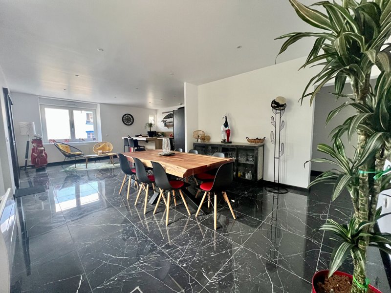 La pièce principale de plus de 40 m² regroupe une cuisine aménagée ouverte sur le salon et la salle à manger, créant un lieu convivial et chaleureux.
